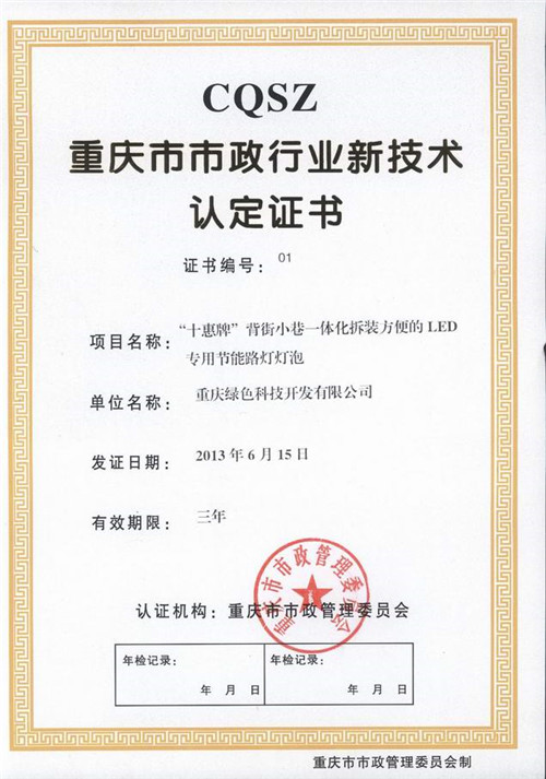 In June 20, 2013, our R & D and manufacturing "ten Hui card" Beijiexiaoxiang integrated detachable LED special energy saving lamp bulb ", after the scene questioning Chongqing City Lighting expert database experts and lighting industry executives and departments, successfully passed the assessment, the product was awarded the Chongqing municipal industry new technology certificate.