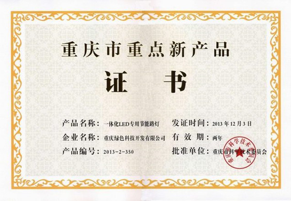 我司研發(fā)、制造的“‘十惠牌’背街小巷一體化拆裝方便的LED專用節(jié)能路燈” 榮獲重慶市重點新產品認定