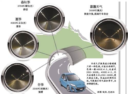 “在不同氣溫和季節(jié),照明系統(tǒng)可根據(jù)隧道外光線自動調(diào)整色溫,以提高駕乘舒適度。”重慶綠色開發(fā)有限公司的法人代表蘇承勇介紹(具體情況如右圖)。這也降低了隧道內(nèi)事故發(fā)生率,且還節(jié)能。該技術(shù)是重慶綠色開發(fā)有限公司與重慶房地產(chǎn)職業(yè)學(xué)院聯(lián)合研發(fā)的,具有自主知識產(chǎn)權(quán),填補了我國高速公路隧道照明領(lǐng)域的空白。